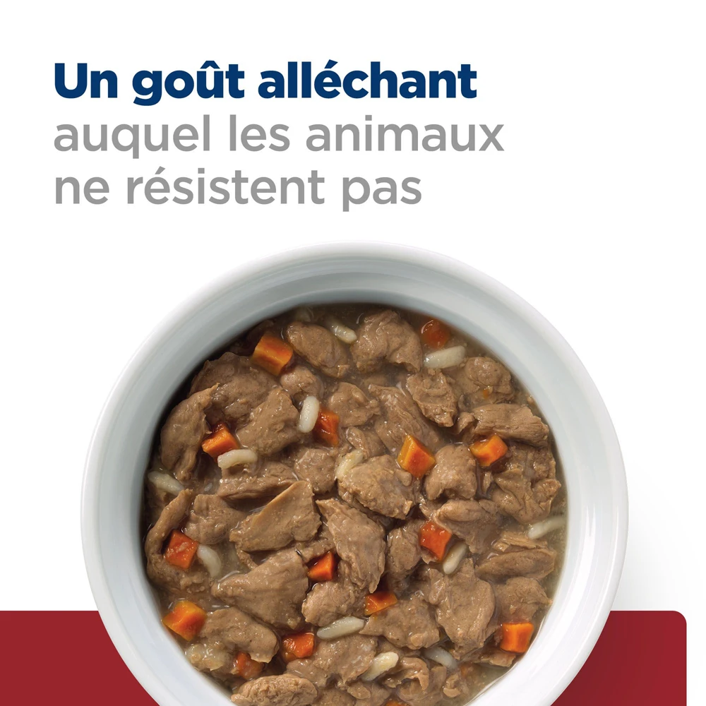 Cet aliment en boîte contient de savoureuses bouchées mijotées en sauce et est élaboré avec des ingrédients sains comme le poulet ou les légumes ajoutés que les chiens adorent.