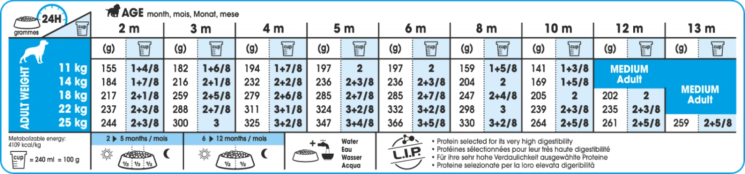Pour chiots de races moyenne (poids adulte de 11kg à 25kg) – de 2 à 12 mois. Disponible en 4kg, 10kg et 15kg.