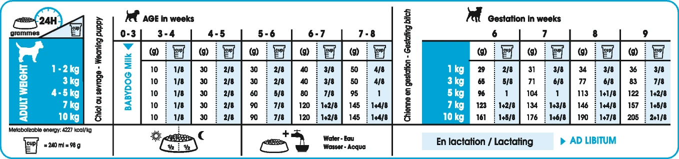 Croquette facilement réhydratable permettant la préparation d’une bouillie très appétente pour la chienne et ses chiots en phase de sevrage. En outre, elle facilite le passage du lait maternel à l’alimentation solide.